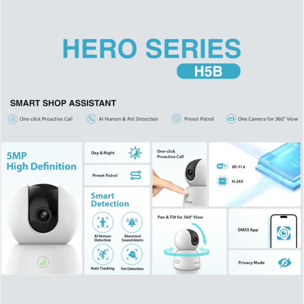 Dahua H5B 5MP Pan/Tilt WiFi Security Camera, 360° Coverage, AI Human & Pet Detection, Auto Tracking, Two-Way Audio, Night Vision, H.265, Indoor Camera for Home & Office